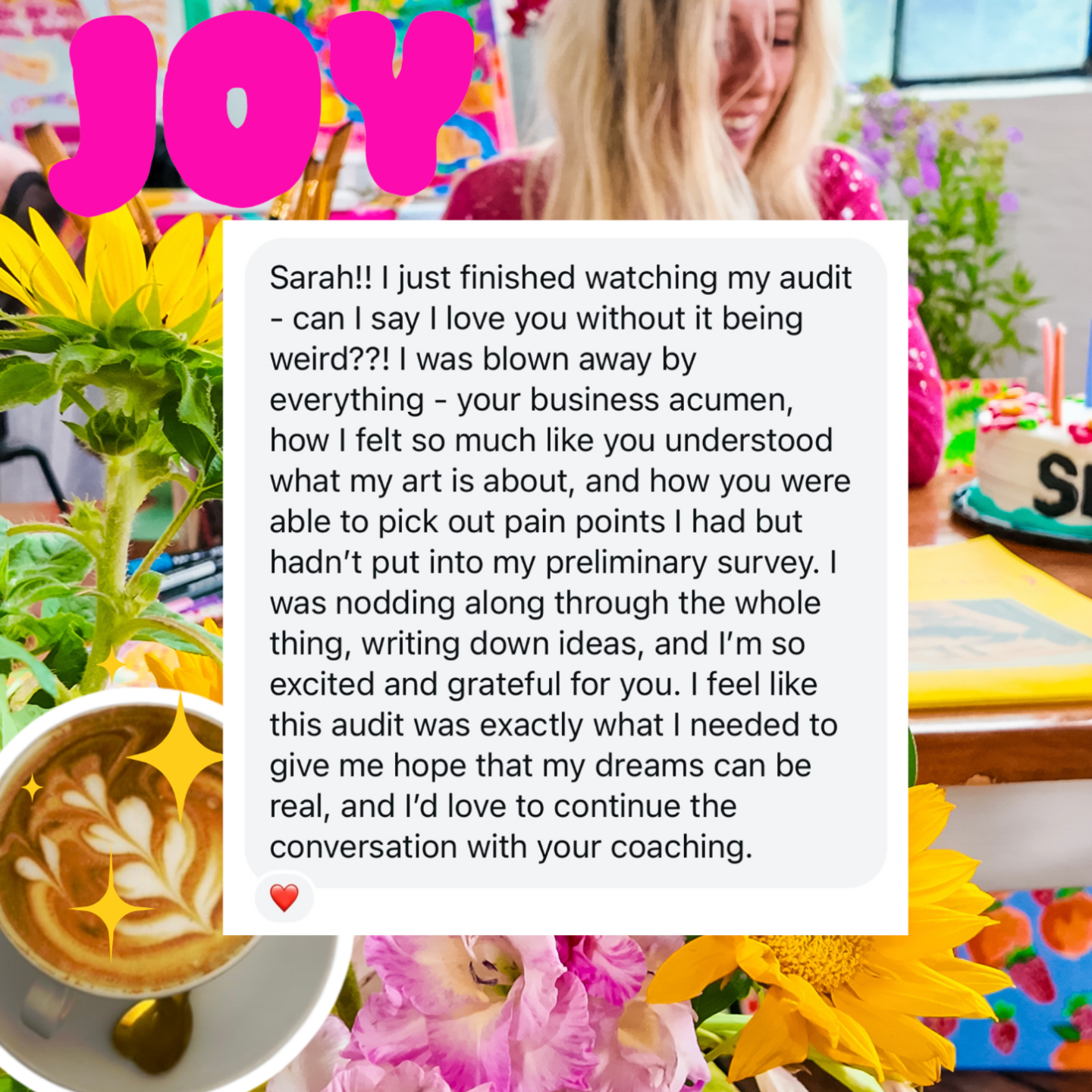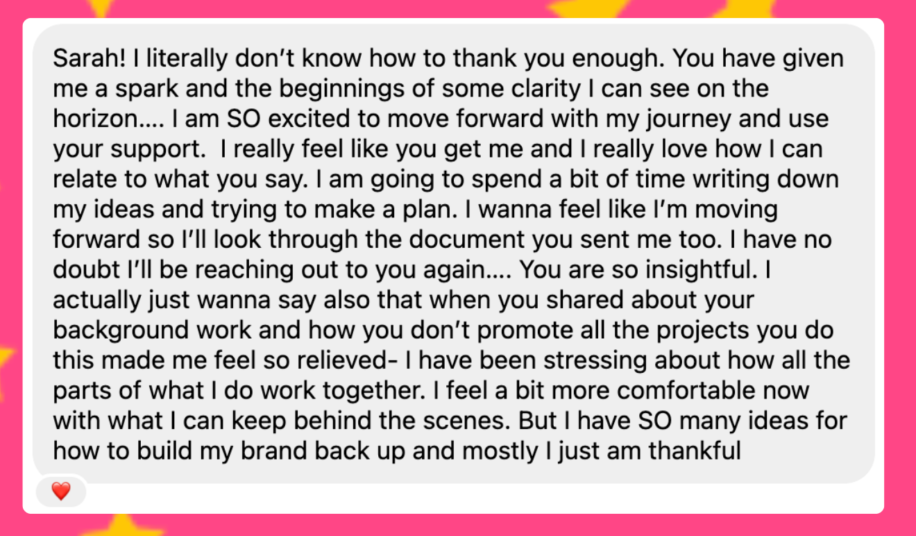 White-glove, deep transformation for creatives ready to stop surviving their goals and start becoming through them. This doesn't just teach you business; it helps you become the version of yourself who can sustain it.