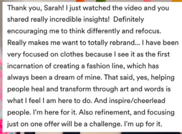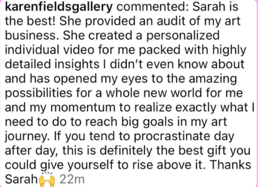I was blown away by everything - your business acumen, how I felt so much like you understood what my art is about, and how you were able to pick out pain points I had but hadn't put into my preliminary survey. I was nodding along through the whole thing, written down ideas, and I'm so excited and grateful for you. I feel like this audit is exactly what I needed to give me hope that my dreams can be real, and I'd love to continue the conversation with your coaching.